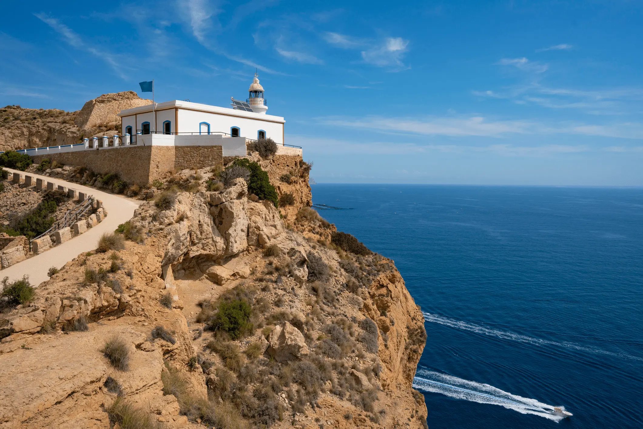 El sendero que conduce al Faro de Albir serpentea a lo largo de los acantilados del Parque Natural de la Sierra Helada. En la punta del cabo, el faro domina el azul intenso del Mediterráneo.
